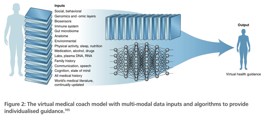 A ‘precision medicine’ paradigm entailing the increasing replacement of pharmaceutical treatments with ‘more devices and behavioural change’ interventions; from-birth genome-sequencing; [77] use of phenomic data; [78] ubiquitous ‘sensor technology’ for biological and behavioural monitoring including molecular diagnostics/ testing kits, portable EEG monitors, [79] wearables and ingestible sensors; [80]