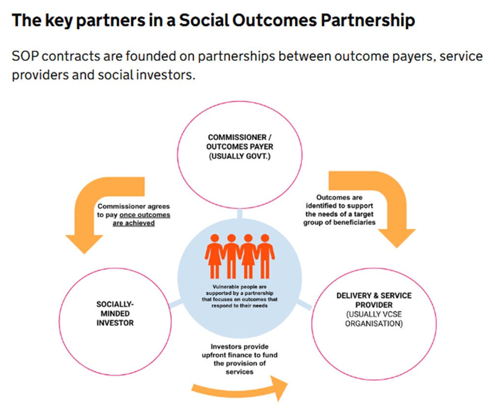 The Cabinet Office’s ‘Centre for Social Impact Bonds’ provides the following definition of SIBs, also known in the UK as Social Outcomes Partnerships, and in the U.S as ‘pay-for-success contracts’: [91]