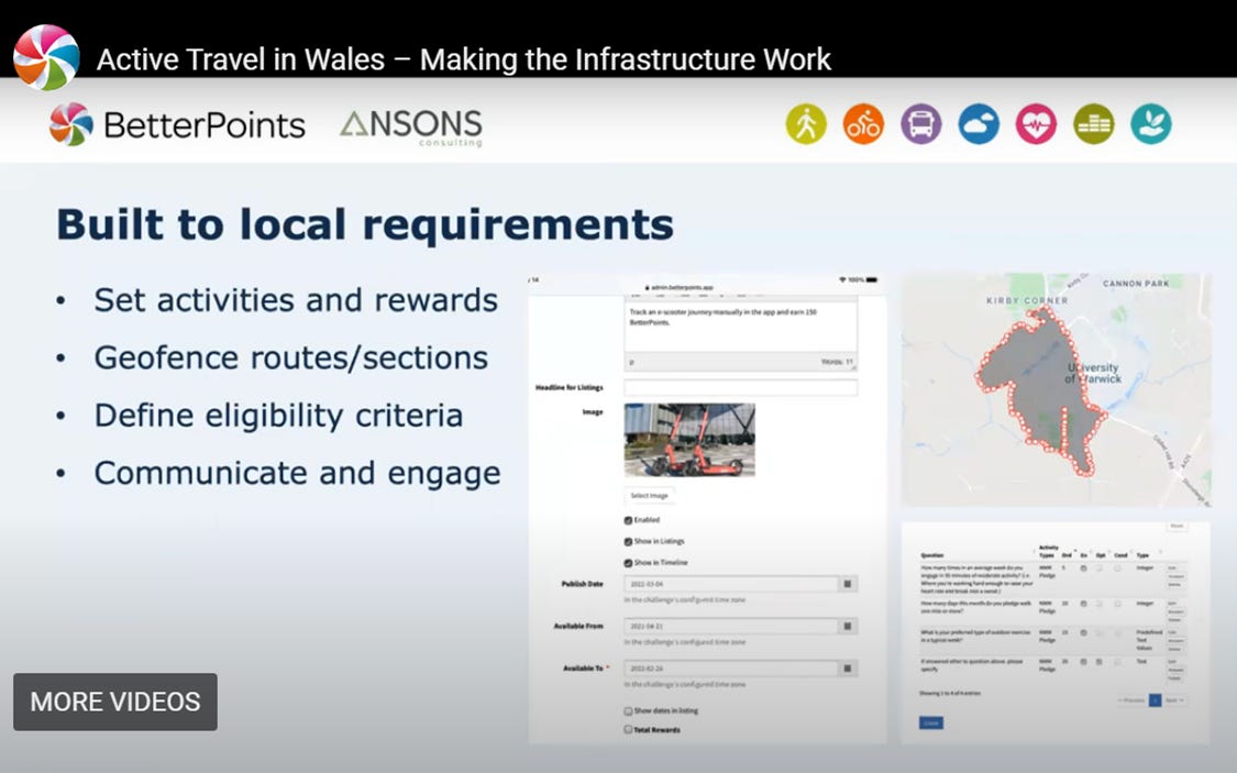 The creator of Ebbsfleet Garden City, Ebbsfleet Development Corporation, funded a local version of the BetterPoints scheme until at least 2022-23. This smartphone app encouraged local residents to record their walking, wheeling, running and cycling activities in exchange for points, which were redeemable as vouchers at selected outlets, charity donations, or entries in prize draws. [33]