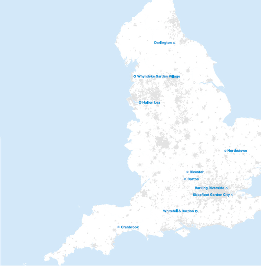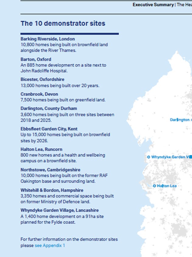 Ten sites for Healthy New Towns were selected from across England and Scotland to showcase ‘new models of technology-enabled primary care’, [23] and ‘digitally enabled local health services that share physical infrastructure and staff with schools and community groups.’ Construction of the exemplar healthy communities began in 2015-2016 and is ongoing.