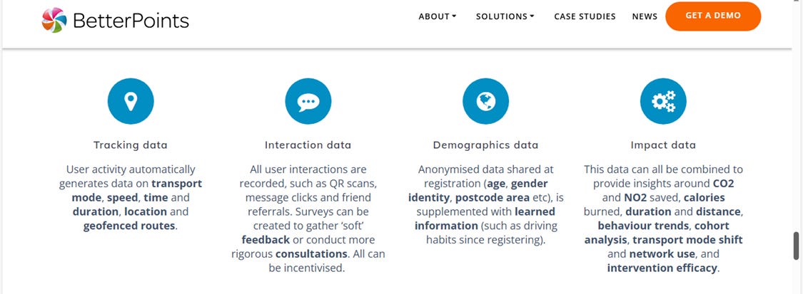 BetterPoints’ conscious positioning as players in the emerging impact economy is evidenced by their having sought and achieved the B-corp certification [36] for ‘positive social impact’. Additionally, they state on their website that BetterPoints programmes are, ‘designed to align with UN Sustainable Development Goals and to help achieve them.’ To do so, clients are provided a dashboard that allows them to ‘track and measure their impact’ on key indicators including ‘carbon and nitrogen savings’, achieved by altering the travel or other behaviours of the target cohort of app users. These dashboards, they explain, enable clients to ‘configure graphs, charts and heatmaps, for example for ESG reporting, strategy analysis, infrastructure planning, and healthcare monitoring.’ [My emphasis.] [37]