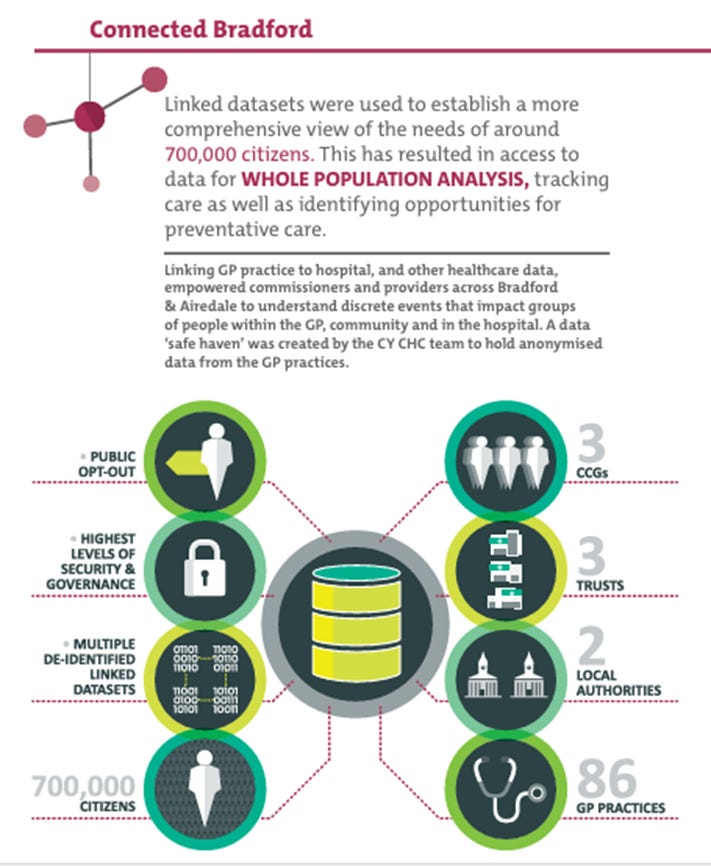 This approach has been carried over into the practice of boundaryless pooling of resident data. In the Darlington project, NHS England boasts of establishing effective data sharing between available health, social care, local authority and voluntary organisation sources, alongside building smart houses in neighbourhoods with ‘built in monitoring and information access.’ [28]